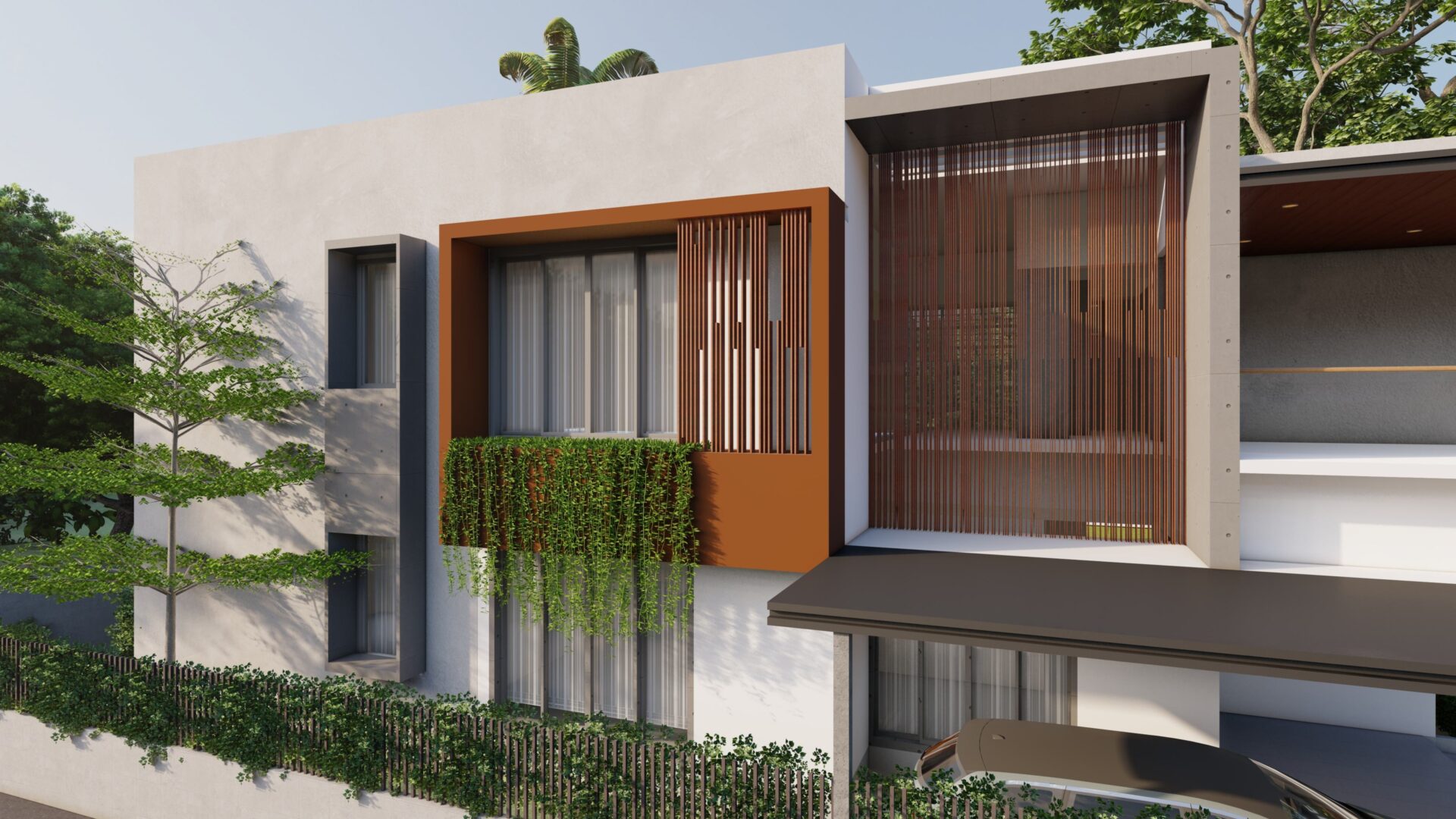 Warm finishes, including corten-toned cladding and natural textures, introduce visual depth, while integrated green features soften the modernity with a biophilic touch. Cantilevered planes and open terraces extend the living environment outward, creating a seamless transition between indoor and outdoor spaces. At ground level, a sheltered entrance and car court enhance functionality without compromising the streamlined aesthetic.