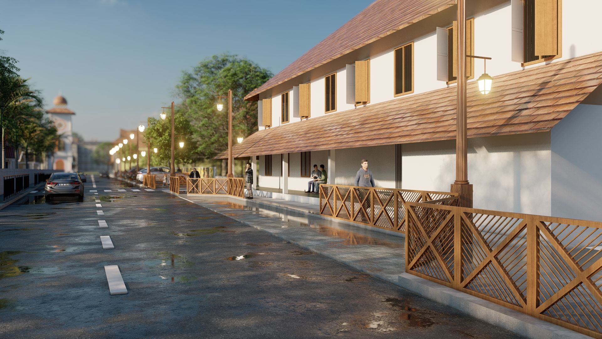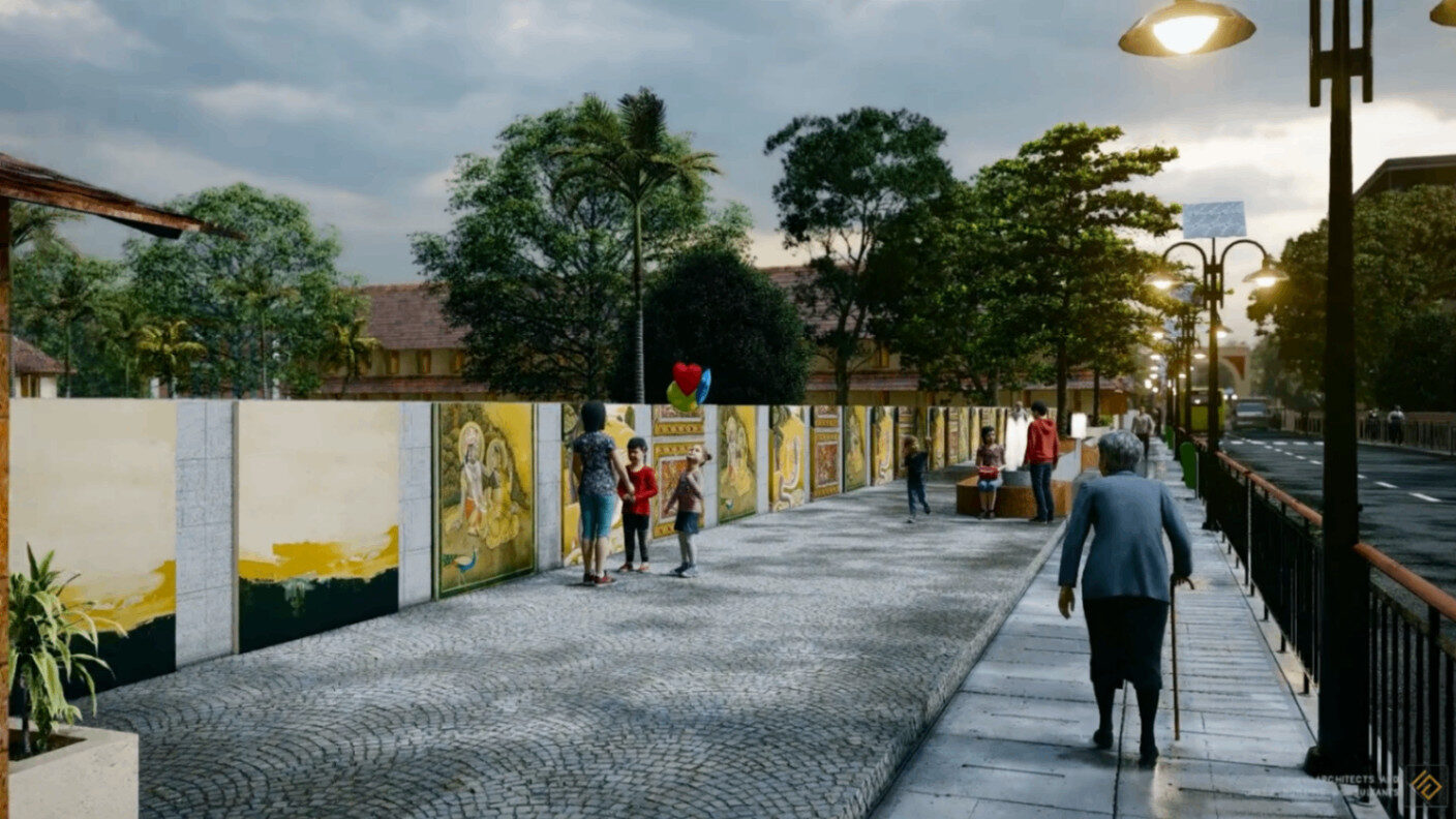This proposal envisions a context-sensitive streetscape and public realm upgrade along the historic Rajaveedhi corridor in Tripunithura. The intervention introduces high-quality pedestrian paving, traditional artistic wall treatments, improved lighting, and barrier-free accessibility to transform the edge condition into a welcoming civic promenade. By integrating local cultural expression with functional urban design strategies, the corridor becomes a safer, more engaging, and community-oriented pedestrian environment that strengthens the identity and walkability of the town’s heritage spine.